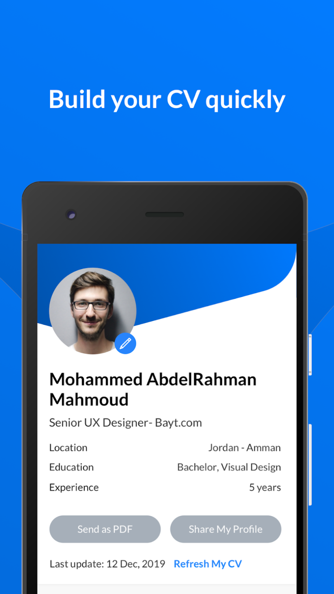 - Register directly from the app or using your Facebook or Google account, and build your CV quickly.