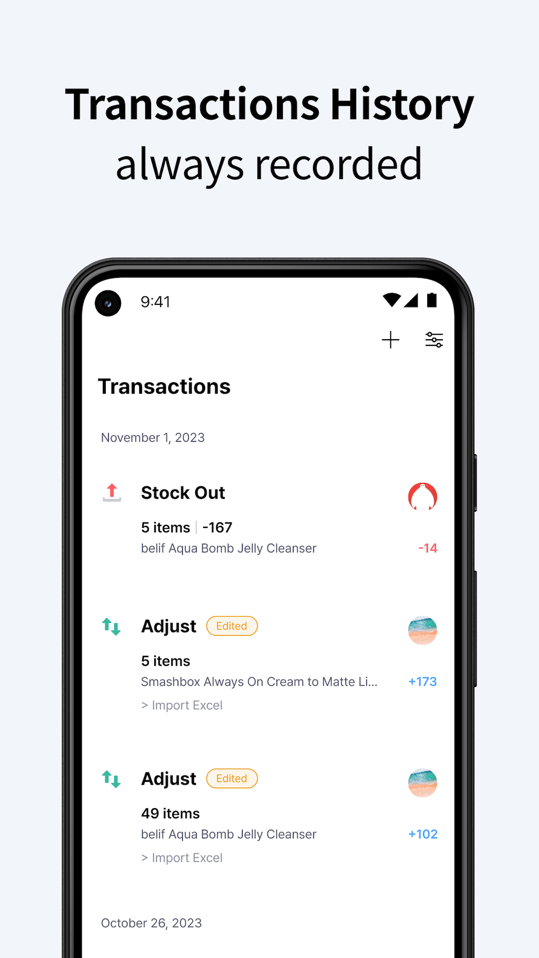 - Register multiple items and record inbound / outbound transactions in bulk with “Import Excel.”