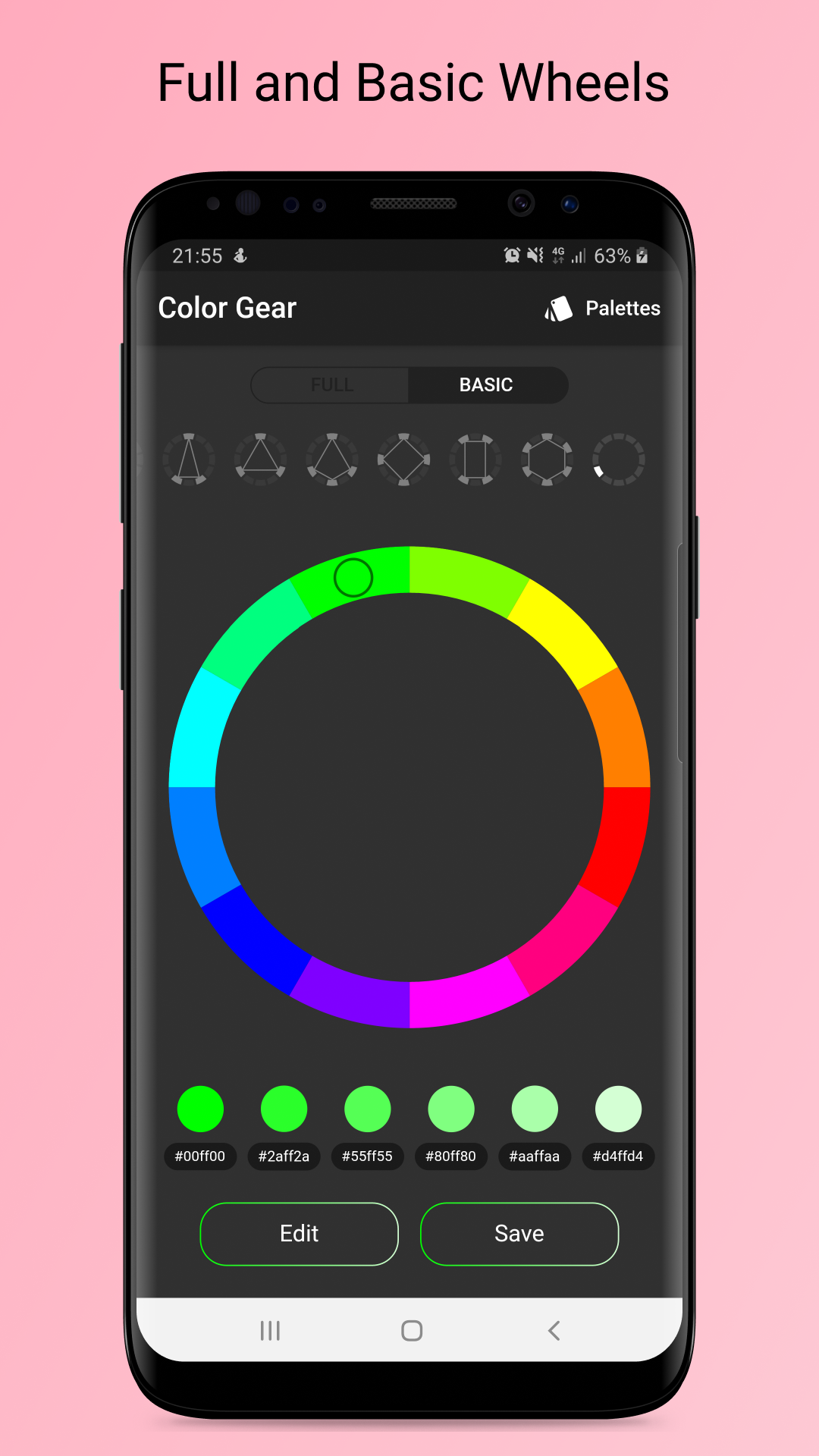 Two color circles, 10 color harmonies and convenient palette editing tool that are always at hand in one application.