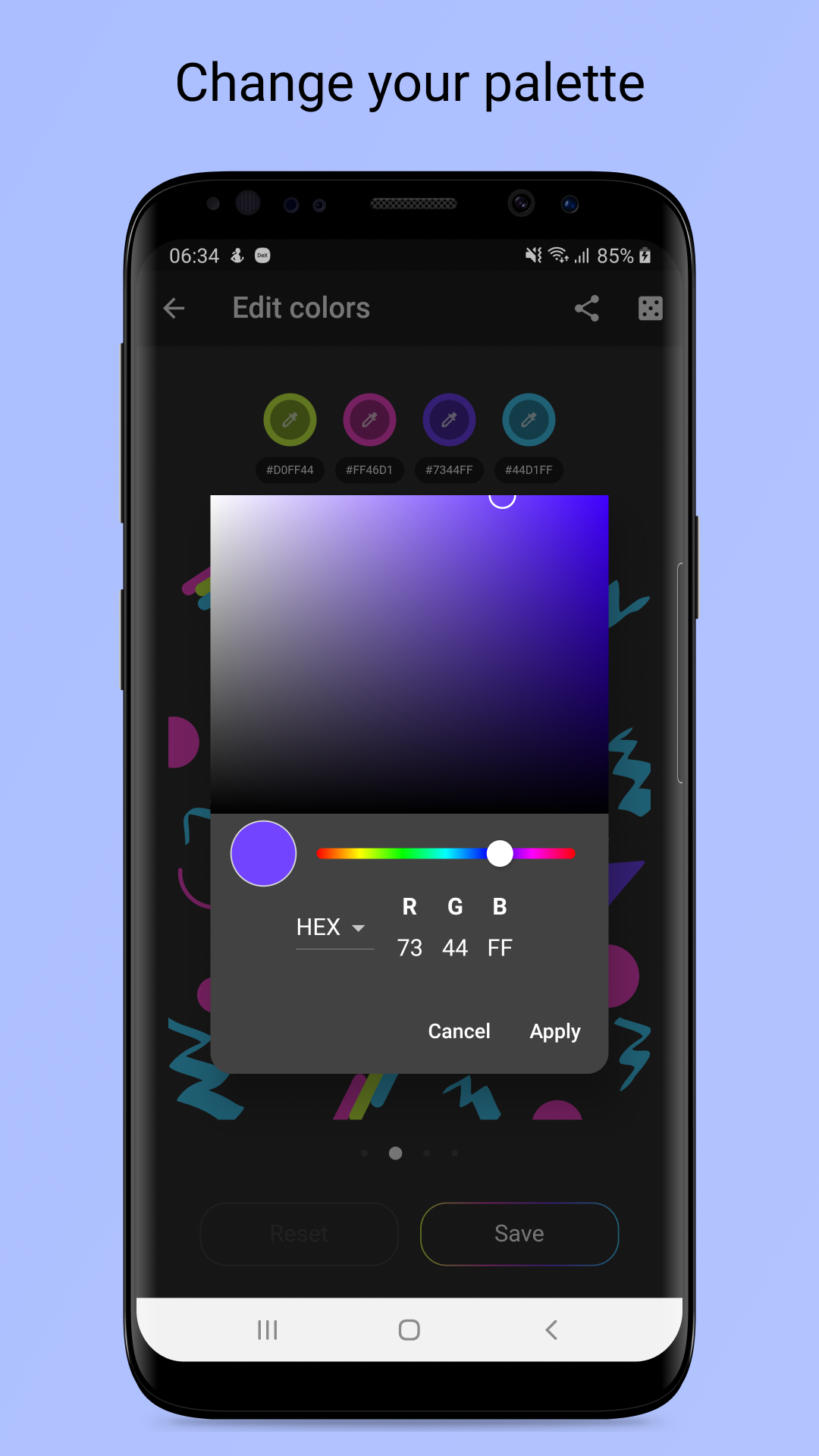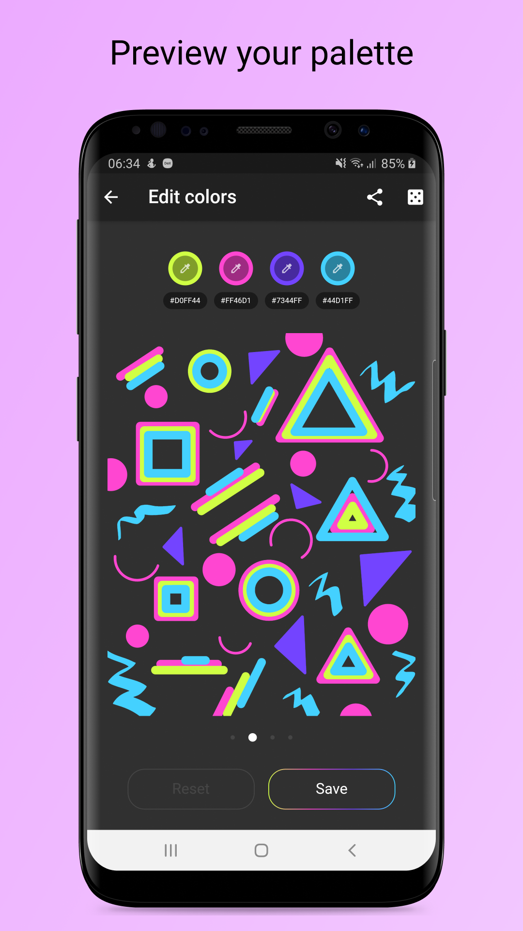 It is very important to balance the quantitative ratio of color in order to make your palette look harmonious in practice. The application has a convenient function to quickly swap colors in the images. There are 3 pictures and gradient in the palette editor's carousel. You can see how the selected colors look in different ratios, which changes randomly.