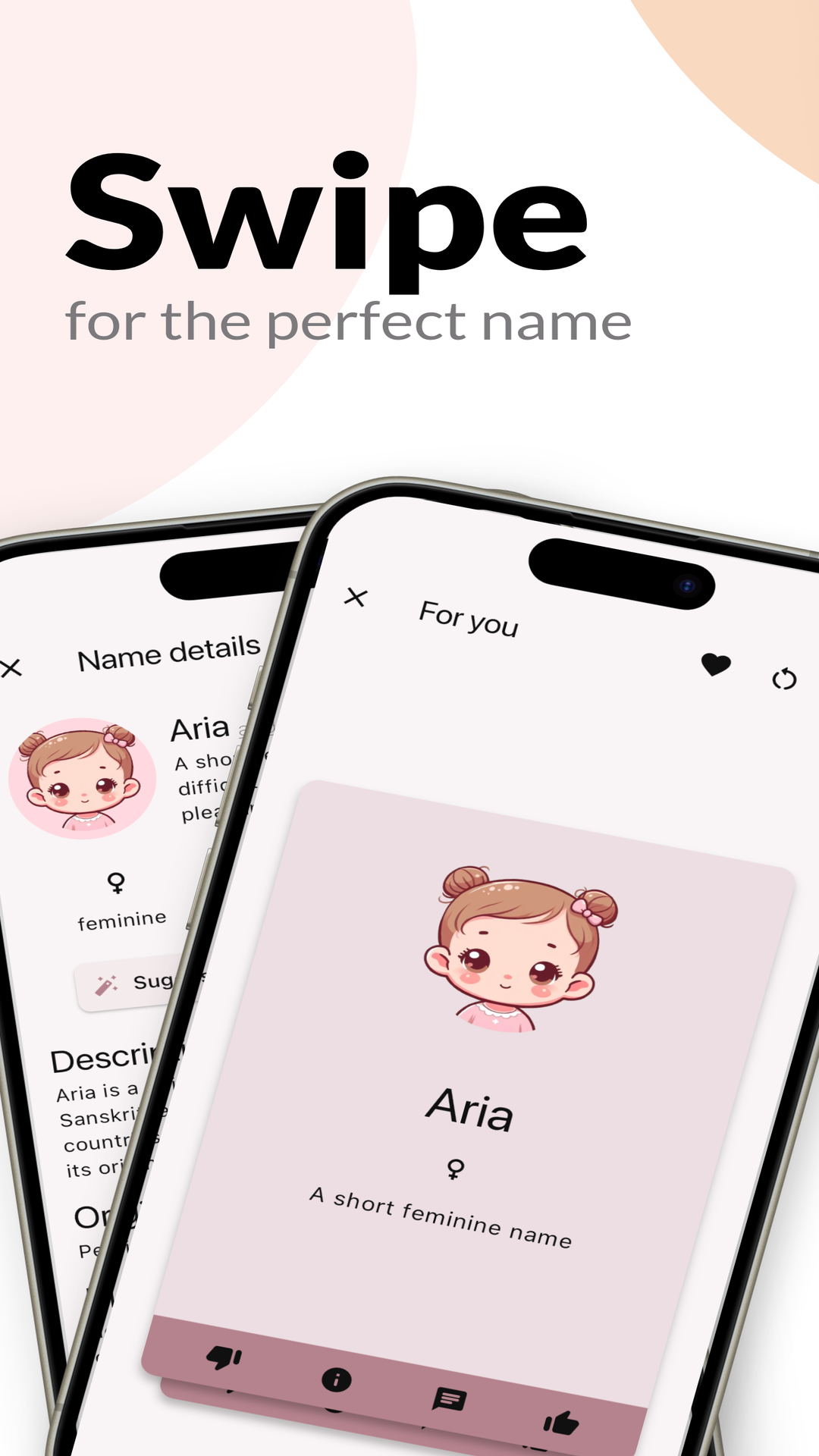 ✅ Suggestions powered by AI: Like a name? Swipe right! Not feeling it? Swipe left! Our Baby-bot AI will learn from you an suggest names that fit you.