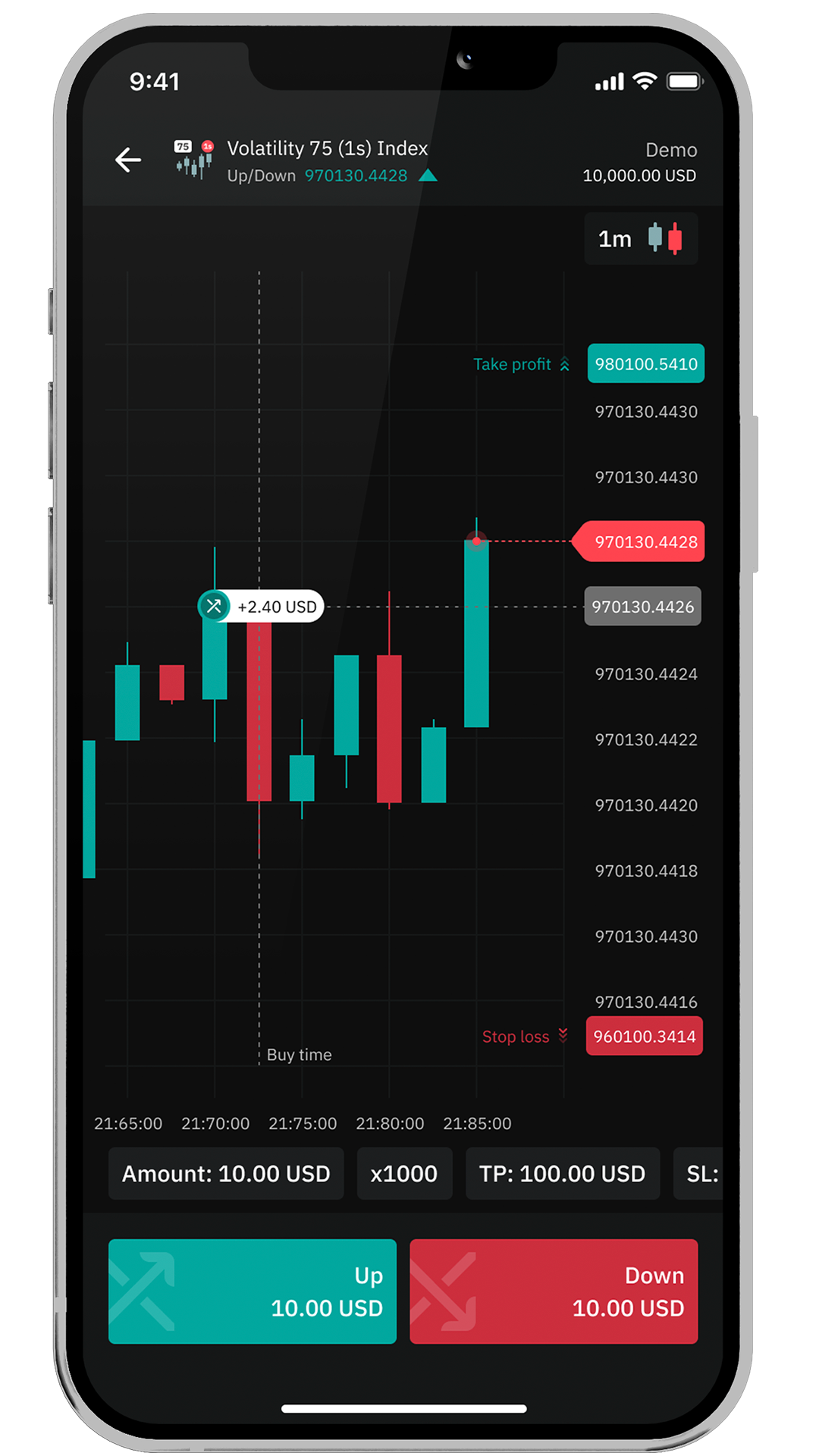 Every new account on Deriv GO is credited with 10,000 USD in virtual funds, so you can try all of the features with zero risk.