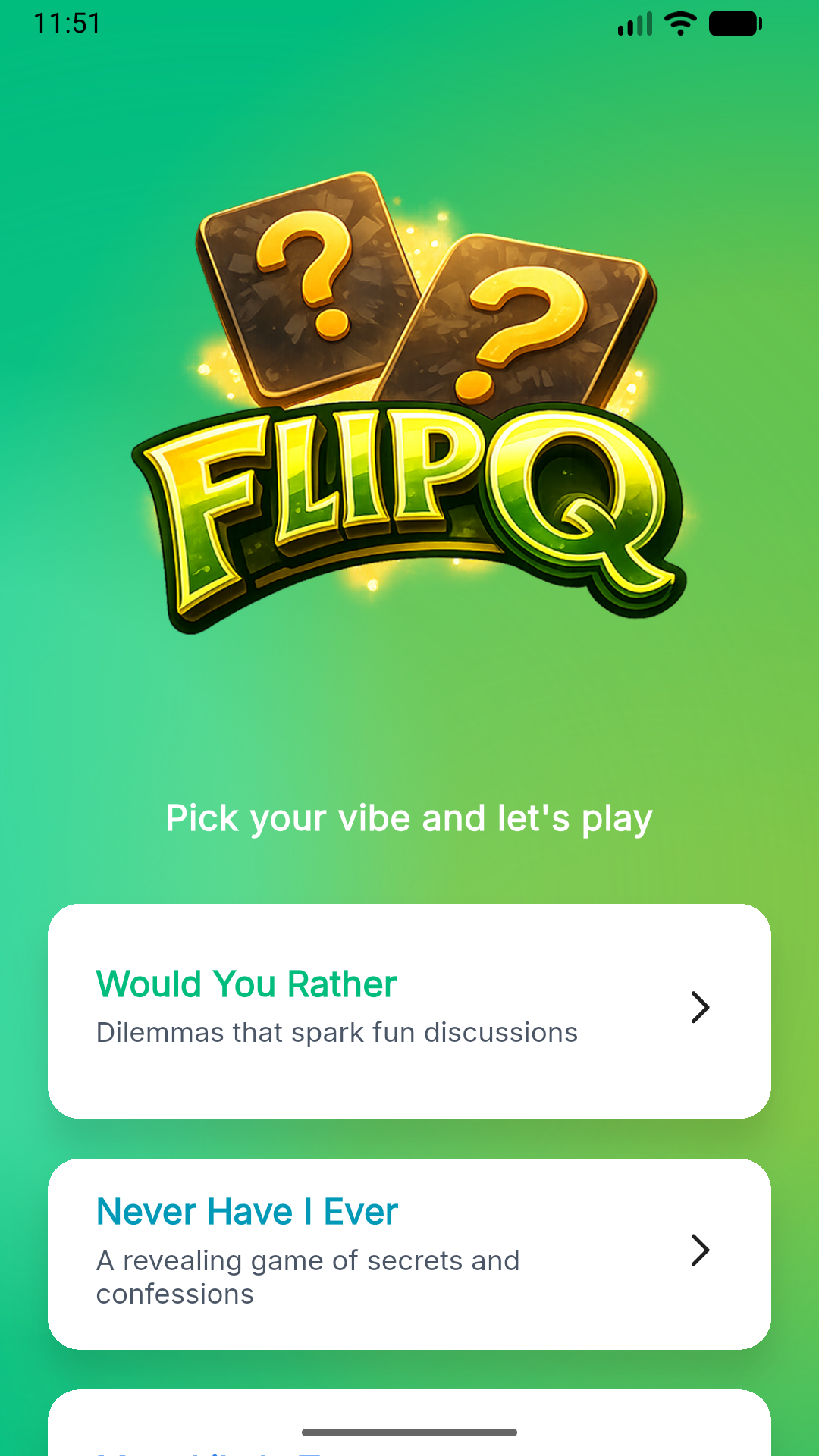 Explore a wide range of game modes including Would You Rather, Truth or Dare, Most Likely To, This or That, Never Have I Ever, Deep Questions and First Date.