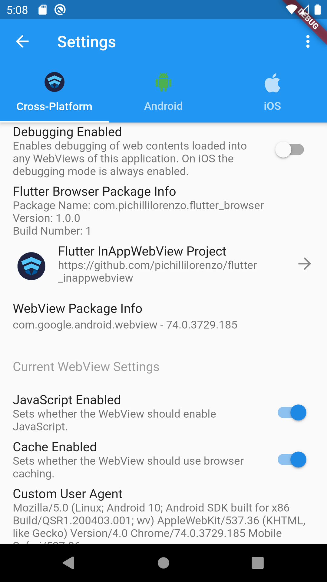 - Settings page, where you can update the browser general settings and enable/disable all the features offered by the flutter_inappwebview for each WebView Tab, such as enabling/disabling JavaScript, caching, scrollbars, setting custom user-agent, etc., and all the Android and iOS-specific features;