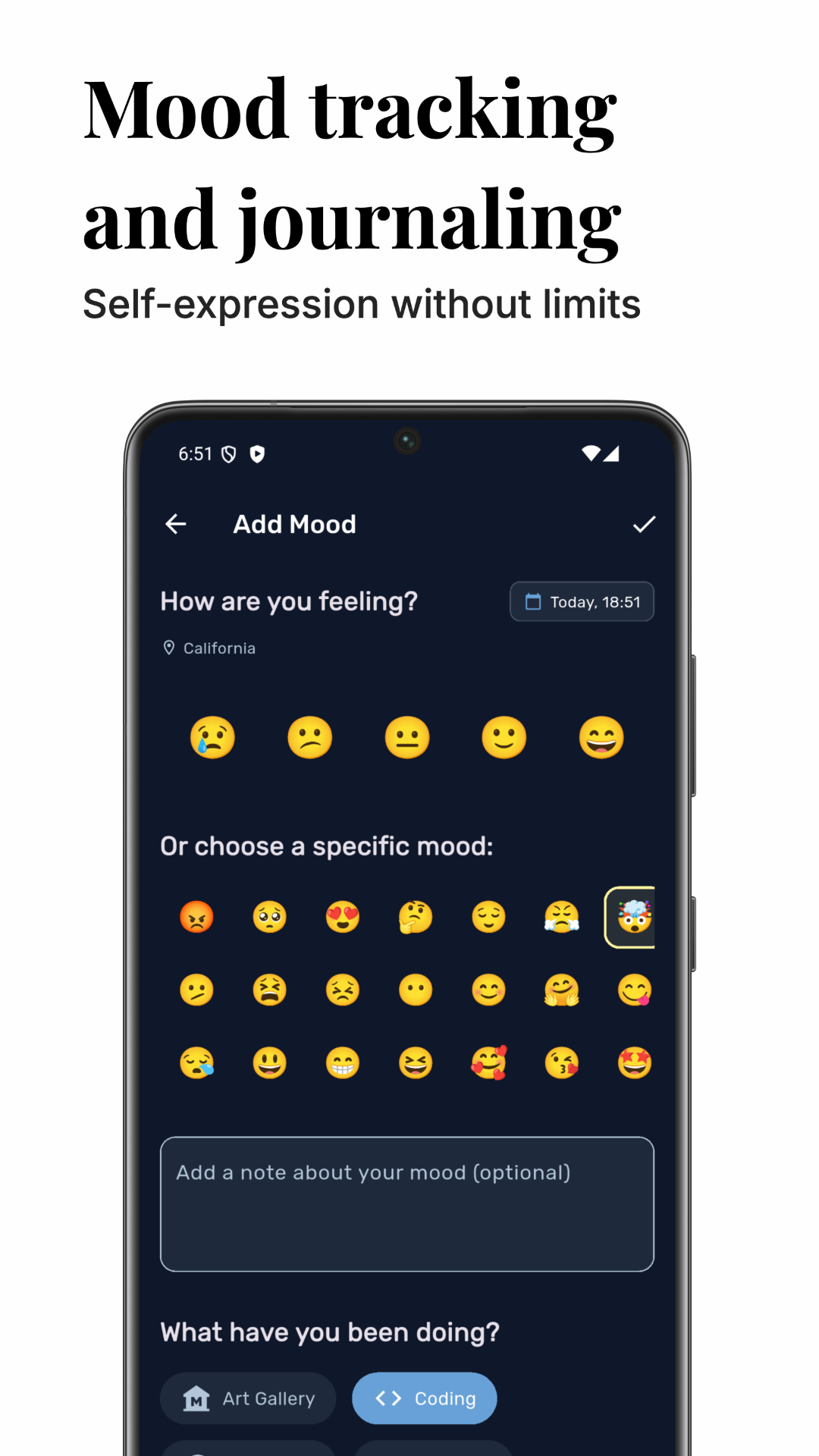 - Location & Mood Map. See how different places affect your emotions and vibes.