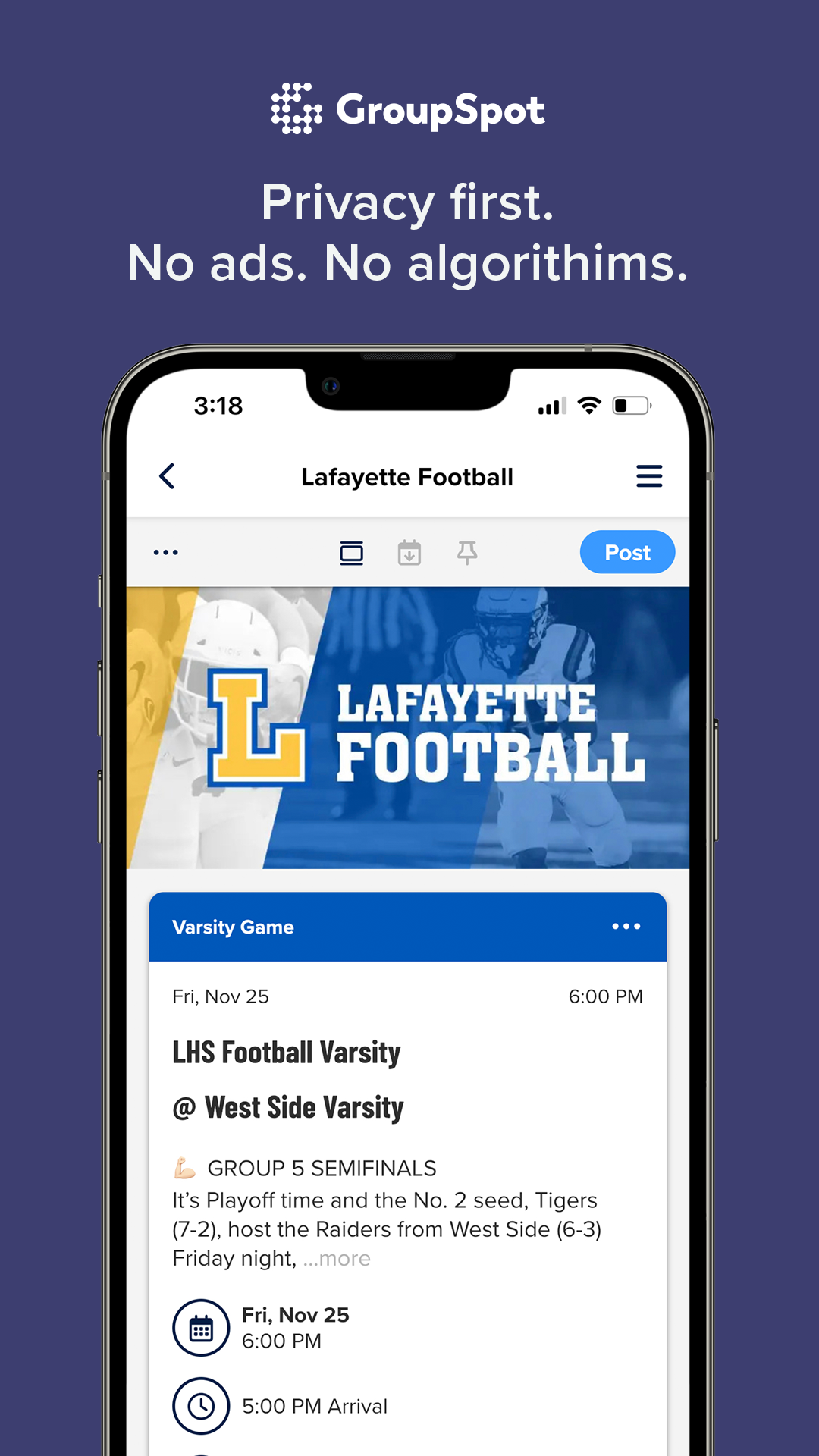 At GroupSpot, we’ve built the ultimate group communications platform optimized for community, utility, and privacy. Groups have all the tools they need to succeed in a single solution, whether it’s a small circle of friends or a town sports league. When it comes to group communications, you won’t find a platform with more flexibility and efficiency than GroupSpot.