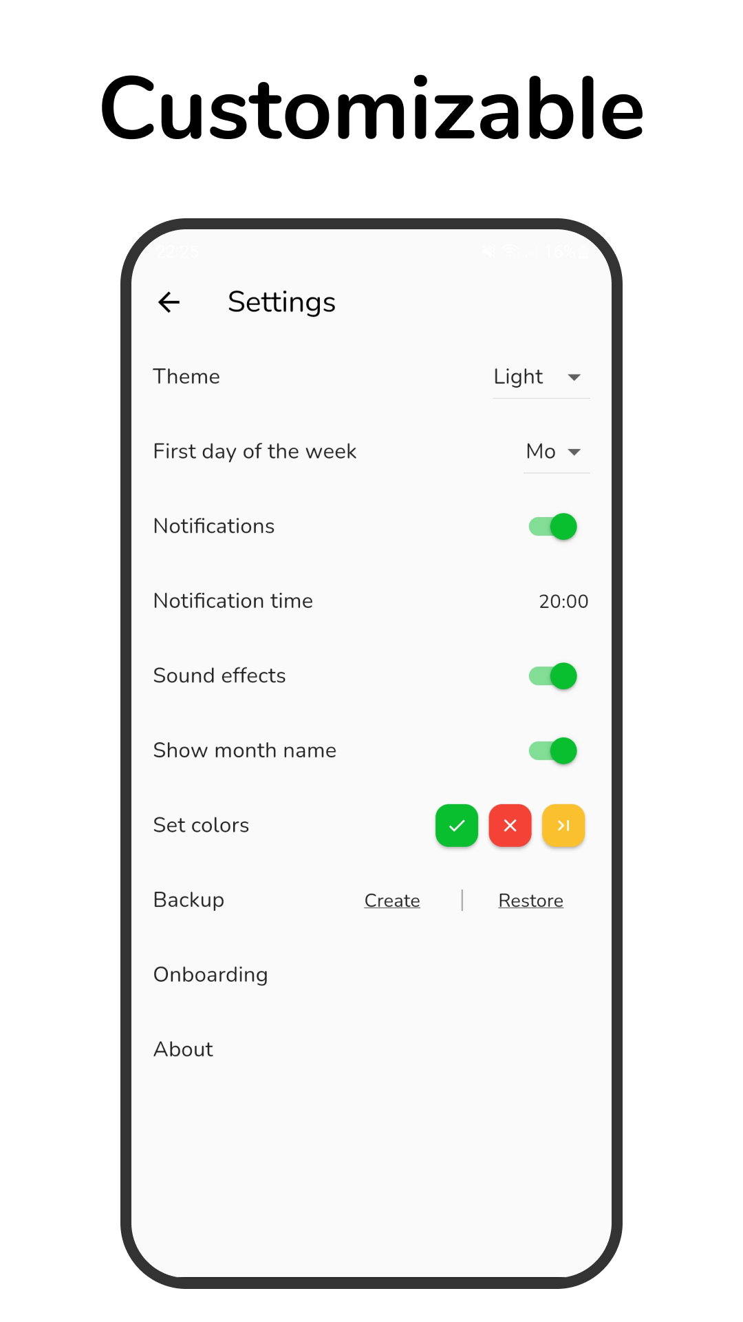 With Habo, you can customize your own habit list, set reminders, and add notes to help you stay motivated. Whether you're looking to improve your exercise routine, eat healthier, or simply adopt better habits, Habo is here to help you succeed.