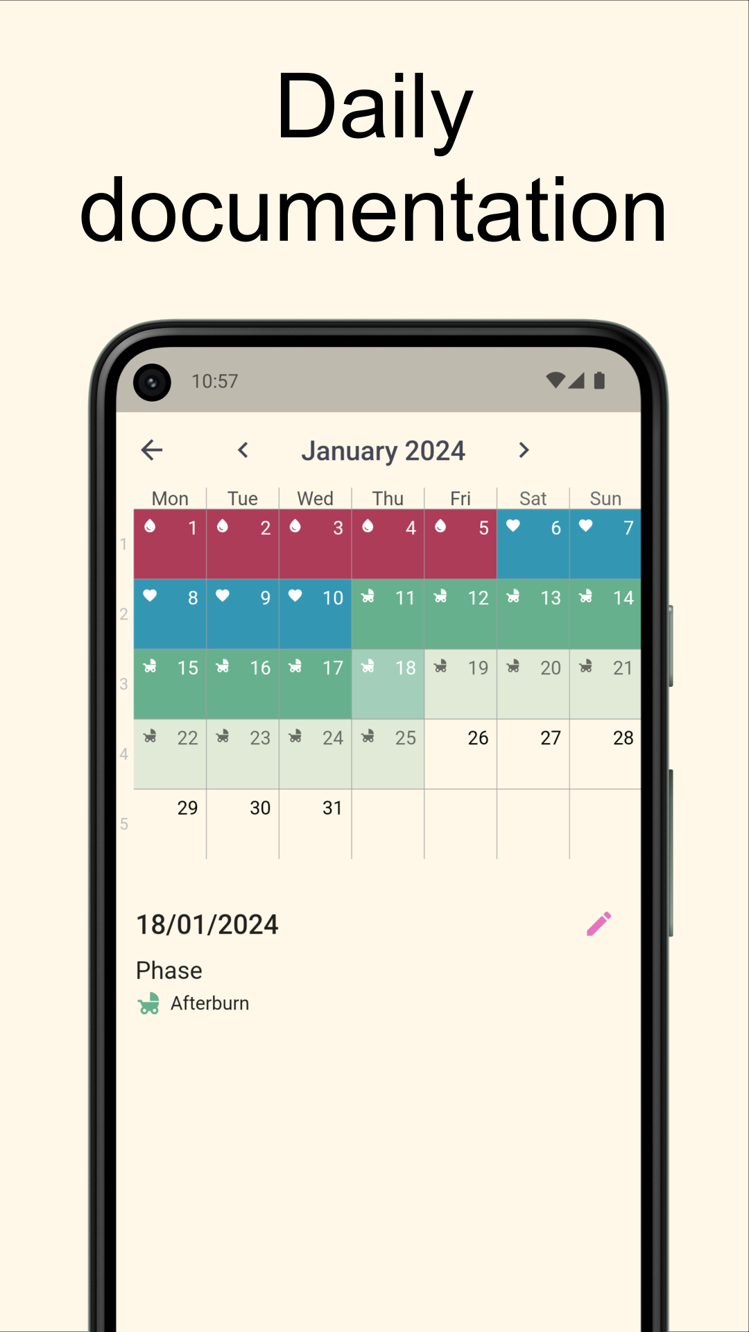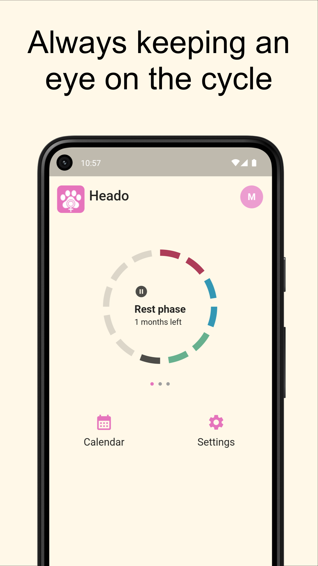 Directly on the home page you can see in which phase your dog is. The simple illustration shows you how long the current cycle phase will last. All previous cycles of your dog are used for the calculation.