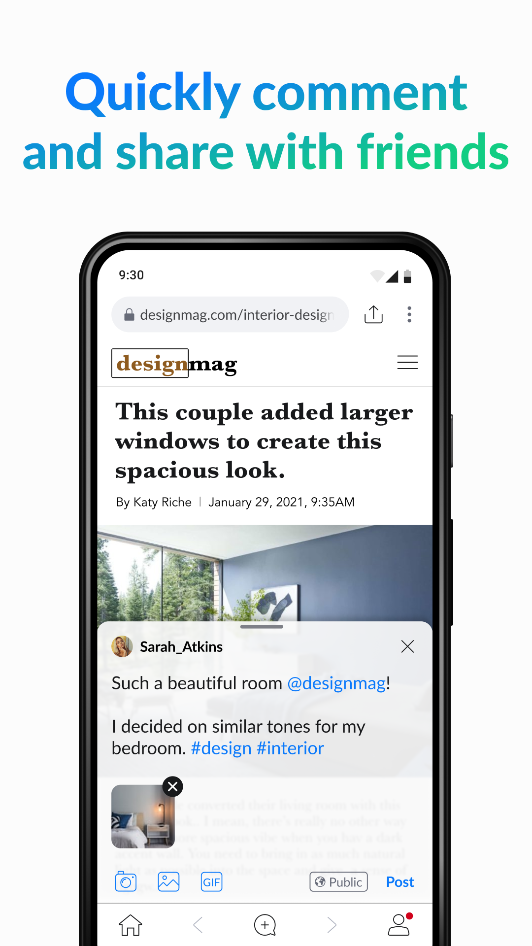 Post comments, pictures and more on any website to share and discuss the content with your followers and friends.