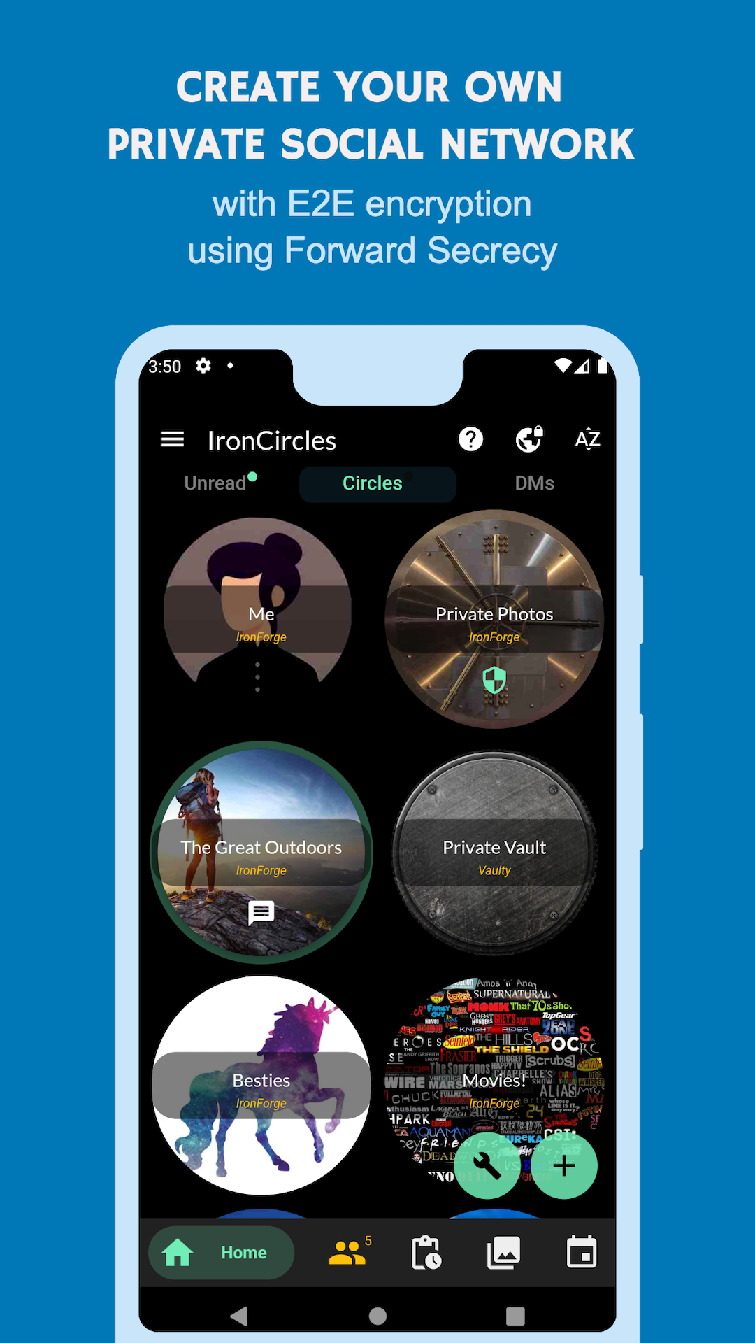IronCircles is a platform that generates private social networks so anyone can have one. Each network is E2E encrypted with Forward Secrecy.