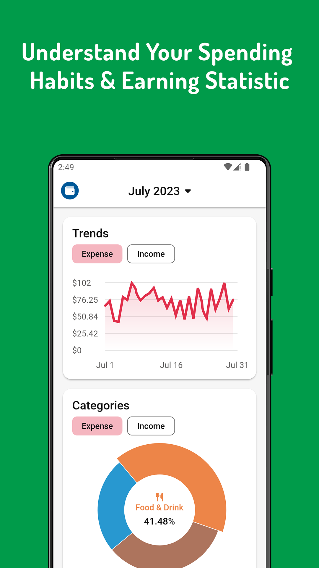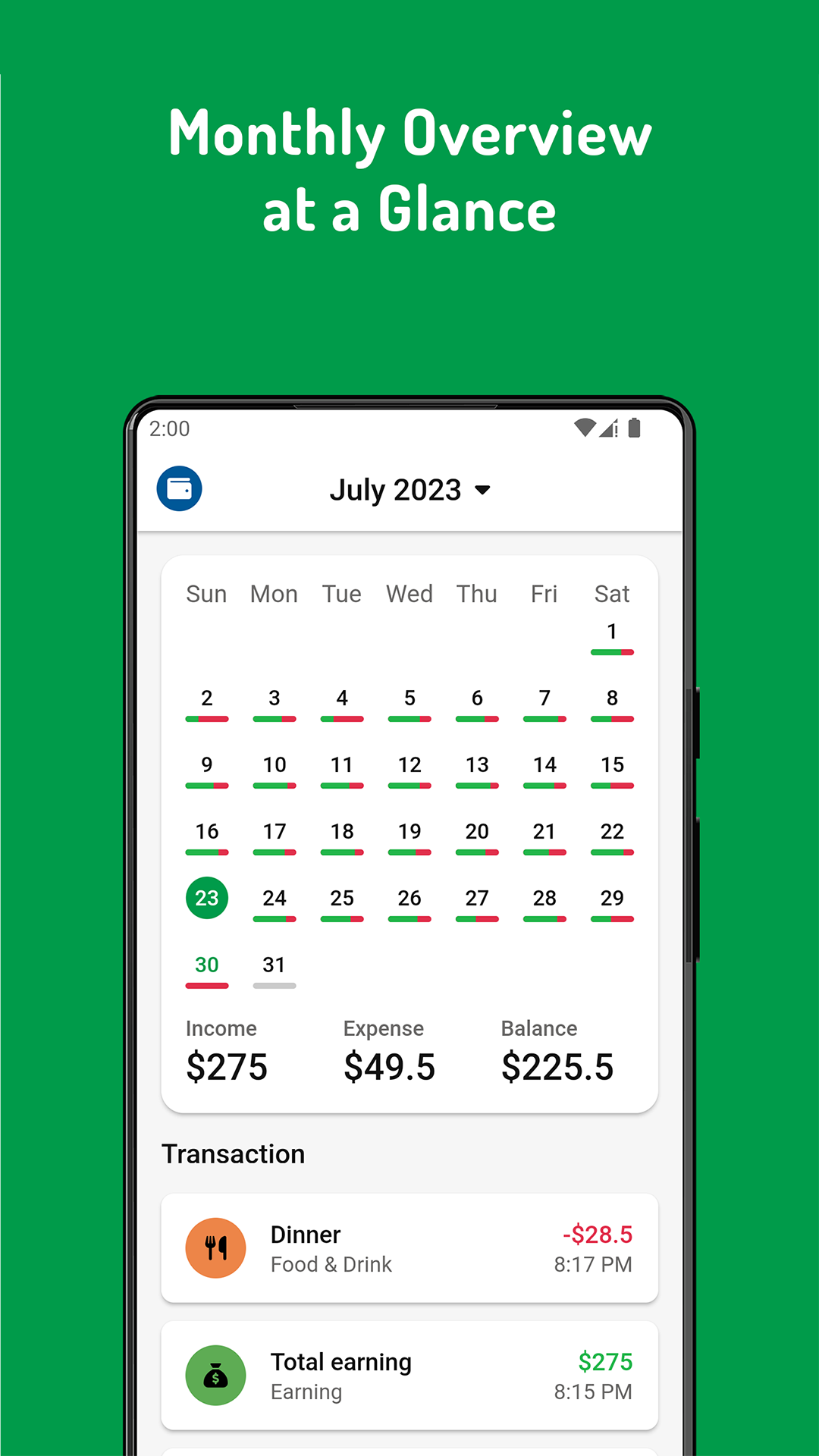 Instantly see valuable, actionable, and interactive statistic graphs, financial overviews, and the state of your finances based on the transaction data you entered. Dive deeper into your category statistics to get more detailed information about your spending, earning, & where your money came and went. Using our calendar feature, you can also see at a glance when you are making a profit and when you are not during a month.
