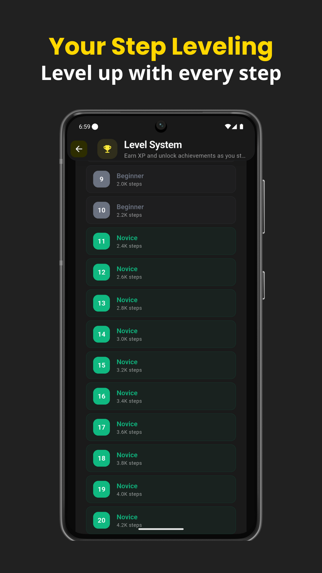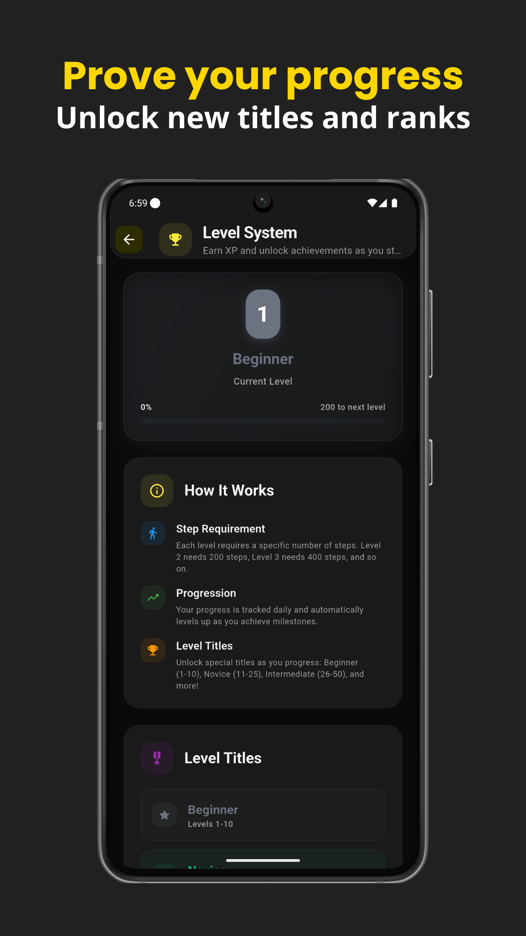 Level and achievement system: Earn experience points (XP) and level up as you walk. Unlock exclusive titles (like "Novice" or "Legend") that show your dedication and progress.