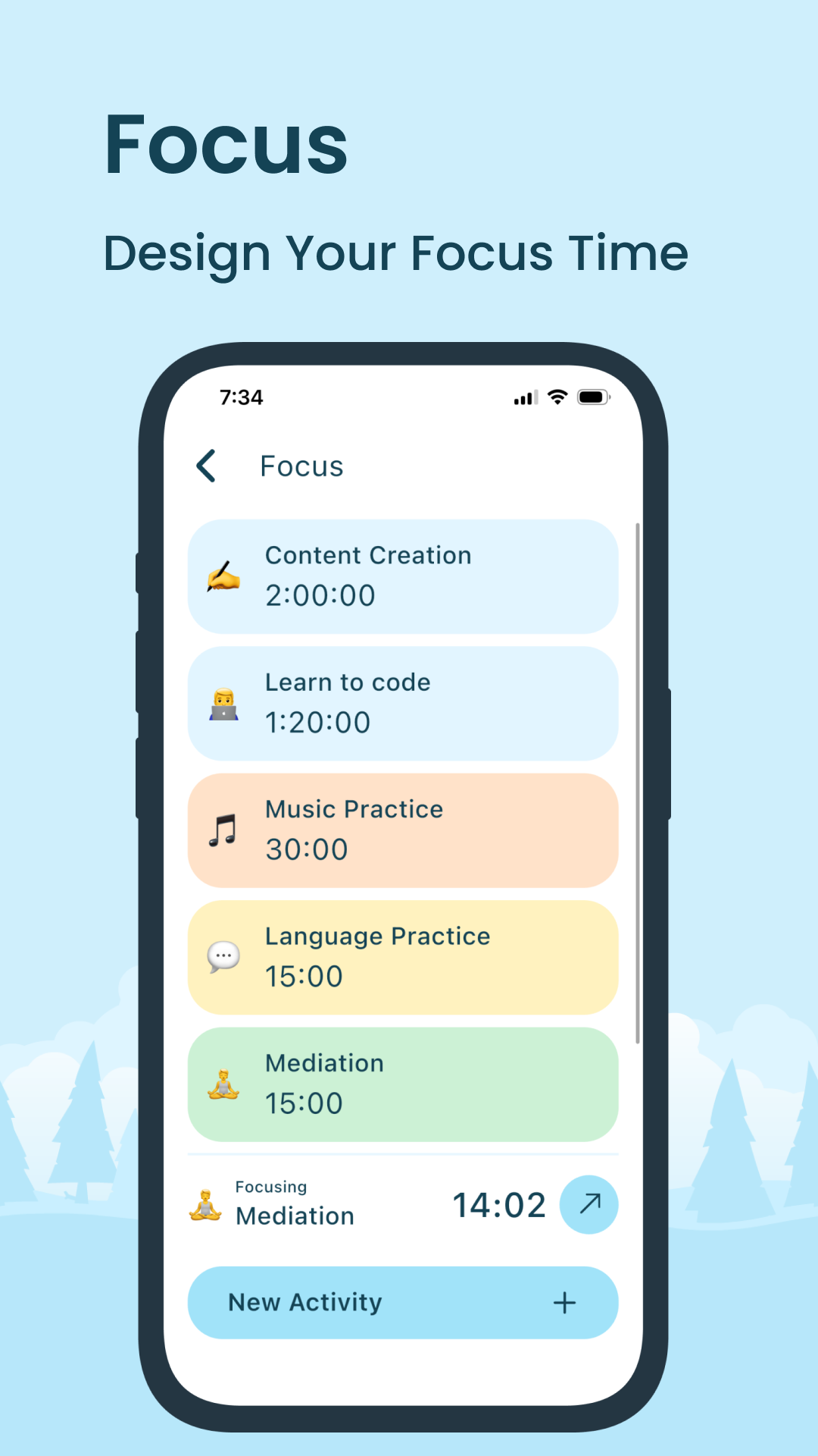 • Focus: Train your concentration through customizable focus timers (pomodoro style). Create different focus activities such as studying, reading, or creative work, and stay productive without burnout.