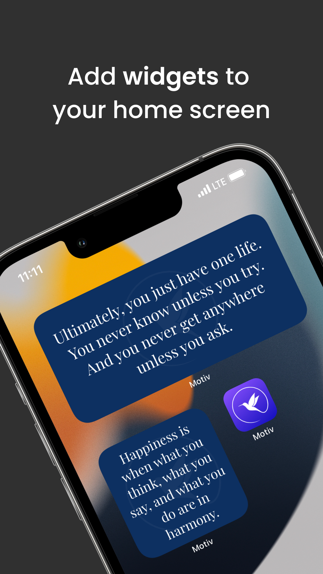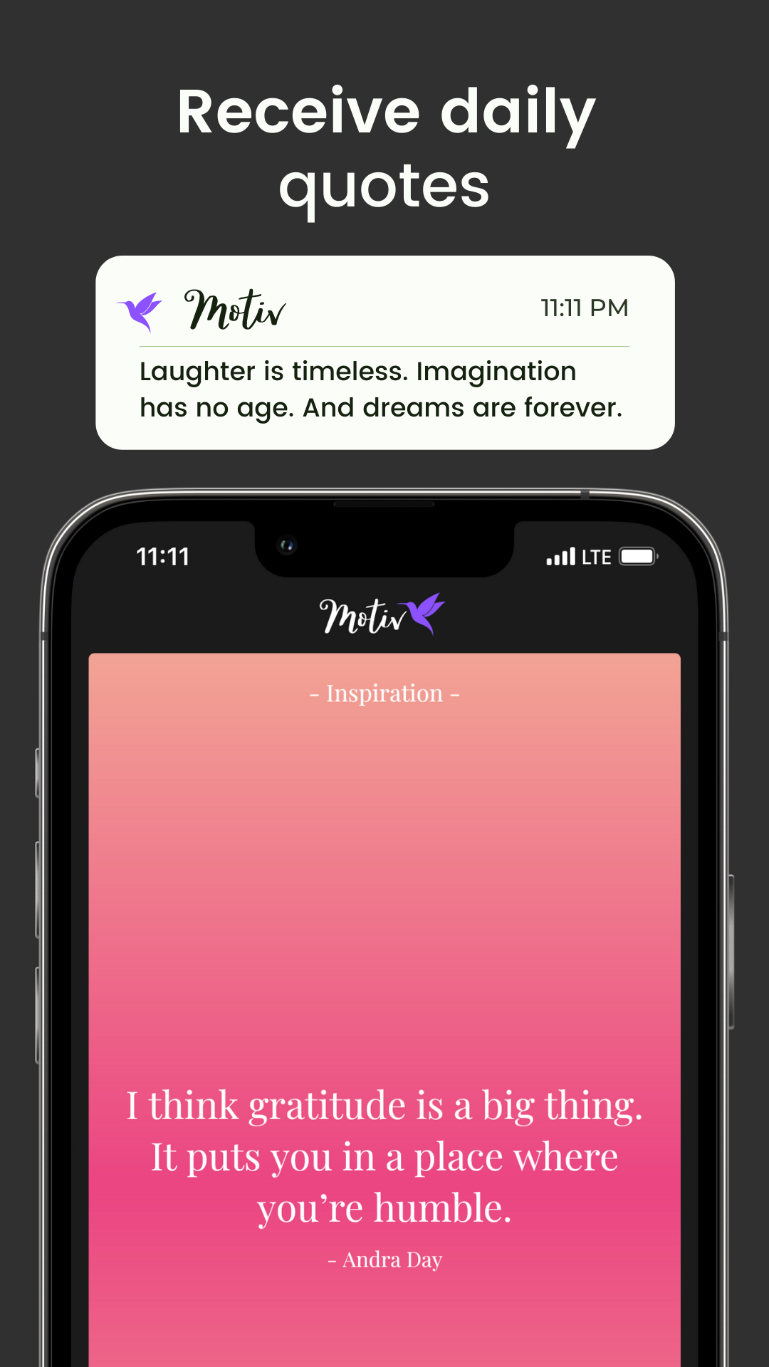 Find your inspiration with Motiv! With Motiv, you will receive motivational quotes to help you find the motivation to be your best self every day. Learn to love yourself and take care of yourself, knowing that you are important and worthy of all the good things life has to offer. Motiv offers thousands of quotes from wise and intelligent people to help you be happy and full of hope.