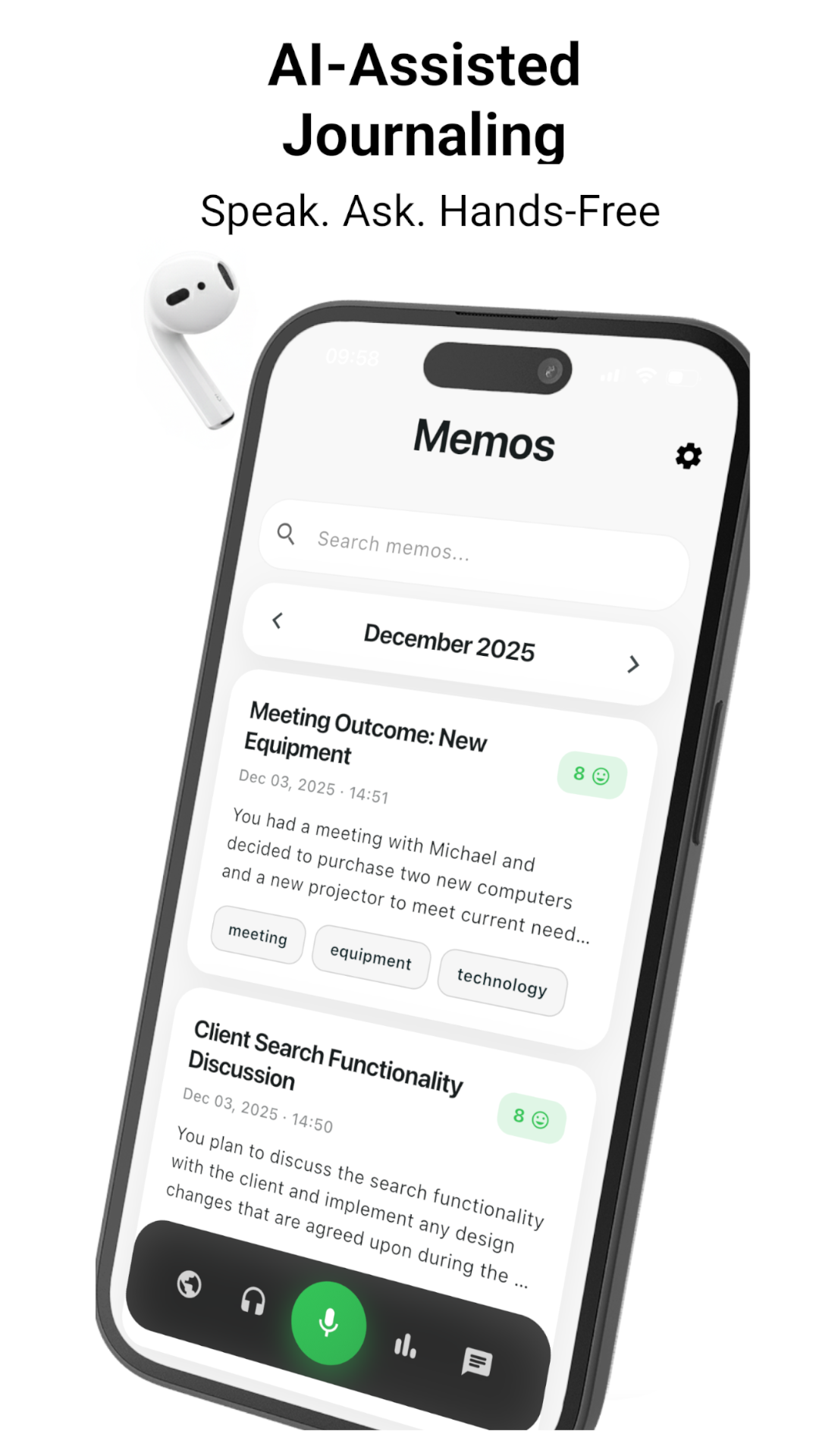 AI-assisted voice journaling experience. Speak and ask, entirely hands-free.