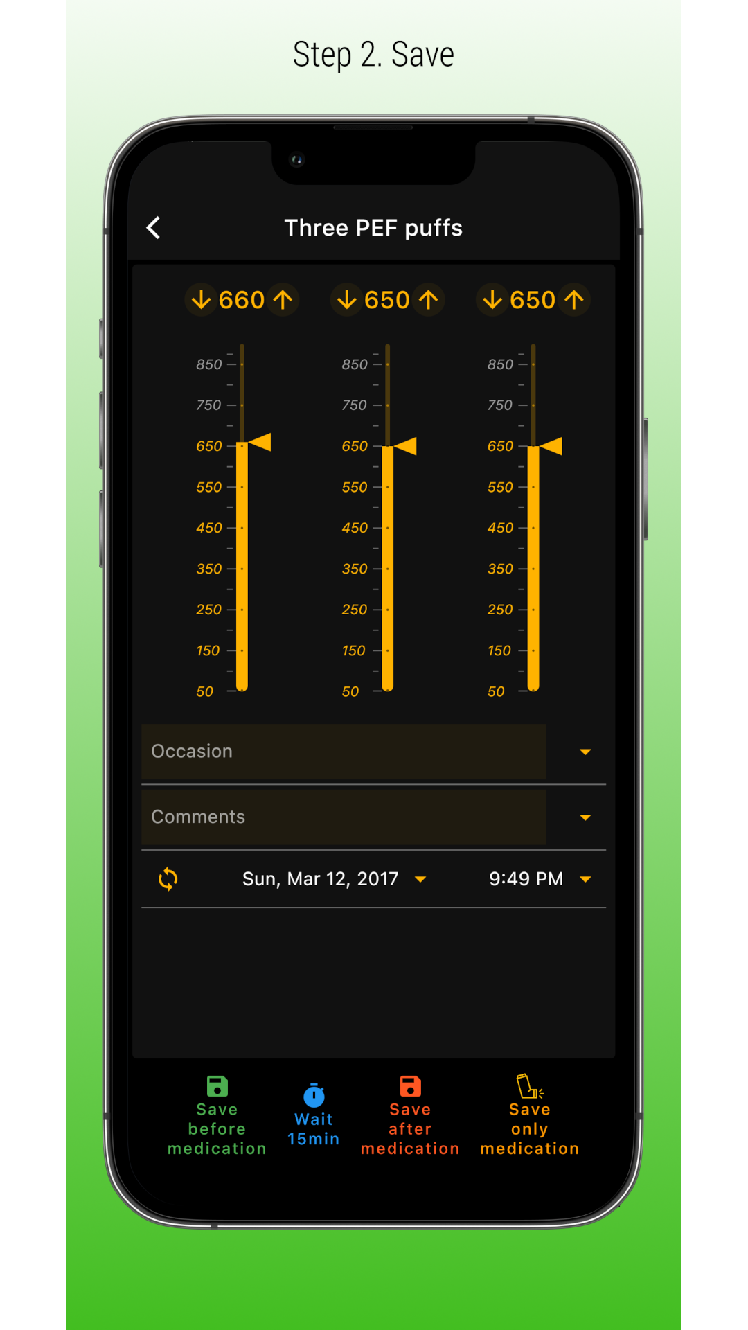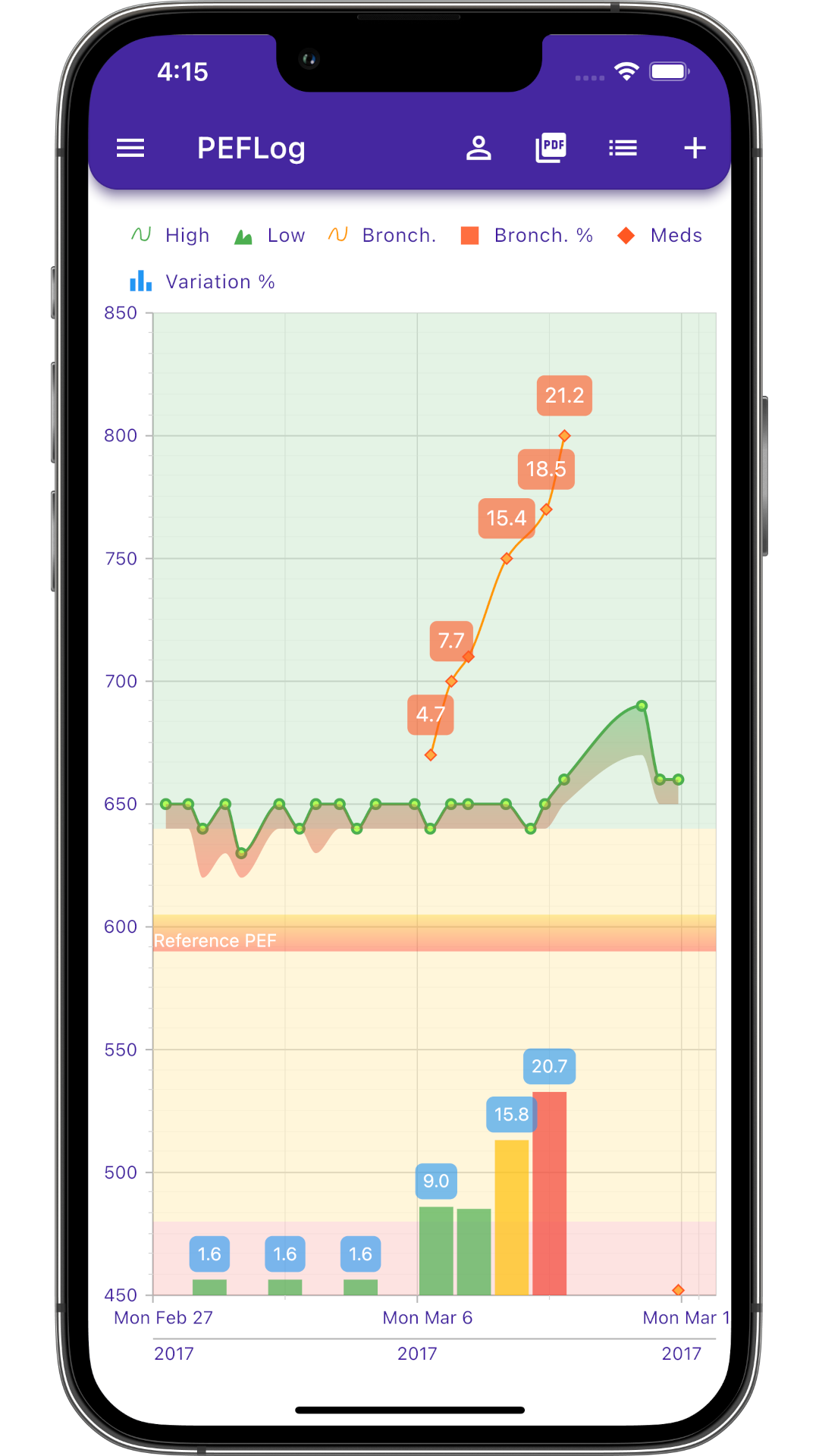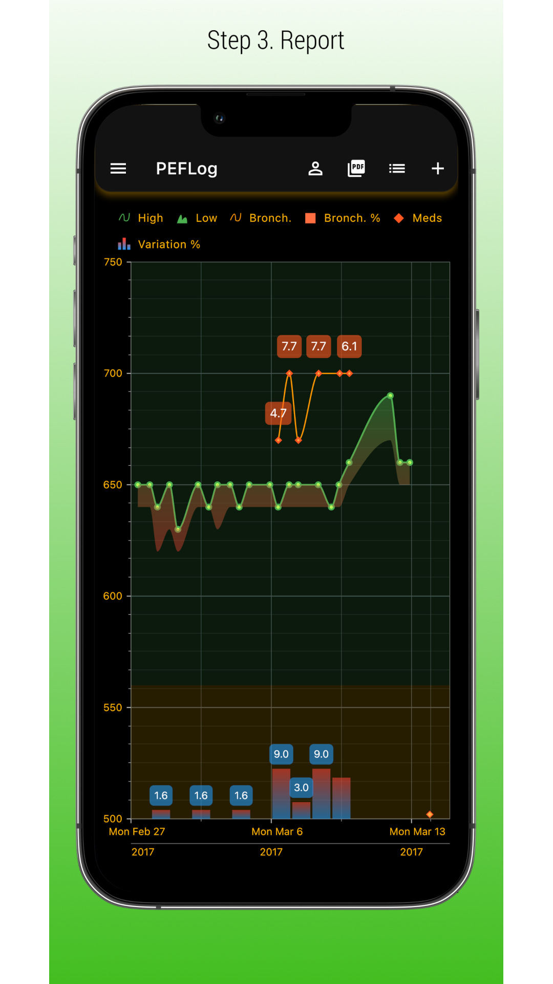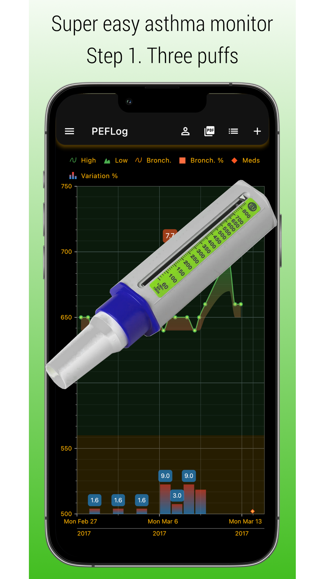 Super easy PEF Log asthma monitor app supports treatment decisions and it works as an asthma assessment helper and users can use it for asthma self monitoring and reporting.