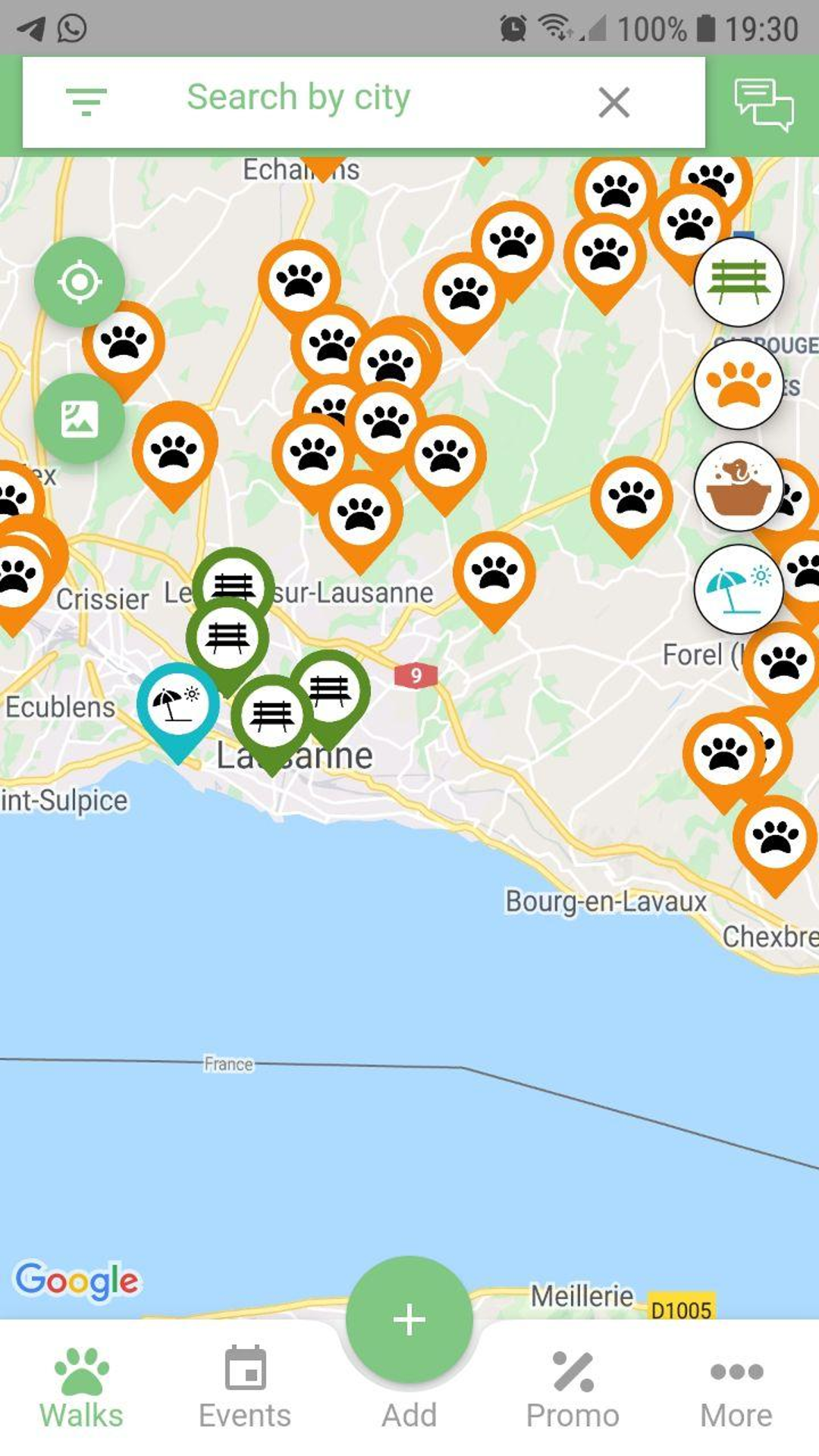Play-Dogs can, thanks to notifications and geolocation, warn its users precisely about events, groups of walks or promotions on services not far from your home!