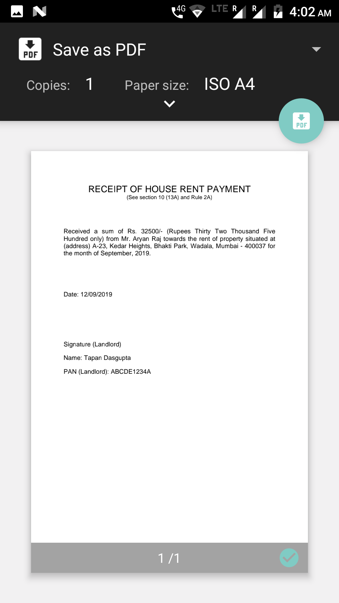 Create rent receipt for Income Tax HRA proof. Save PDF, print directly or Whatsapp/E-mail/Google Drive share.