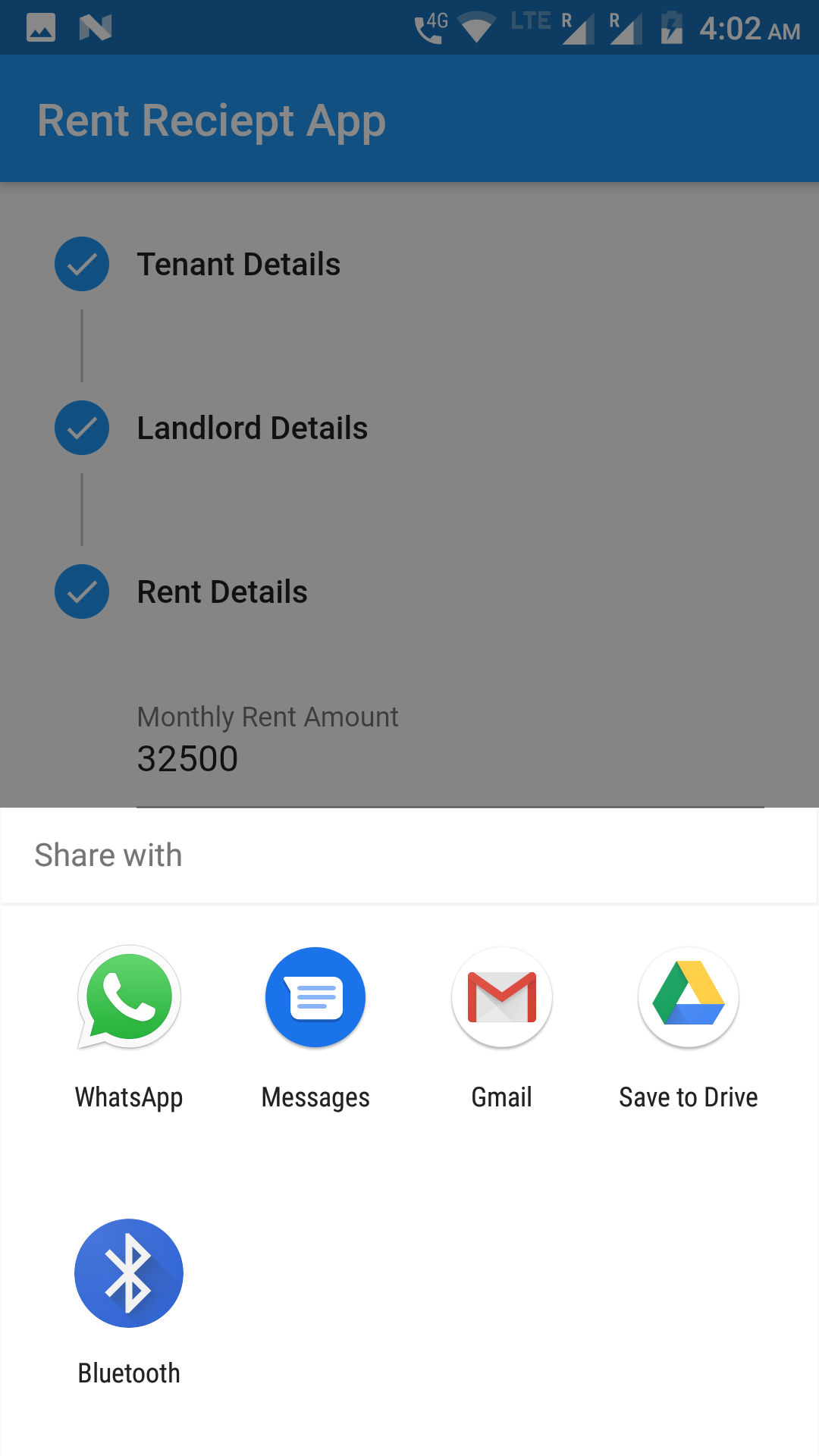 Just fill in the required information and choose to save Rent Receipt as PDF or share directly via Whatsapp, E-mail, Google Drive, Bluetooth, etc.
