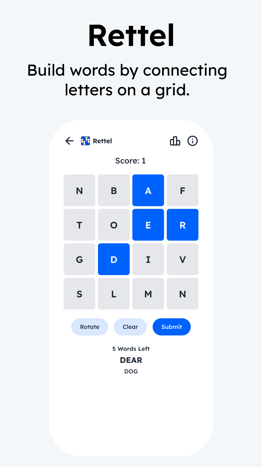 Build words by connecting letters on a grid.
