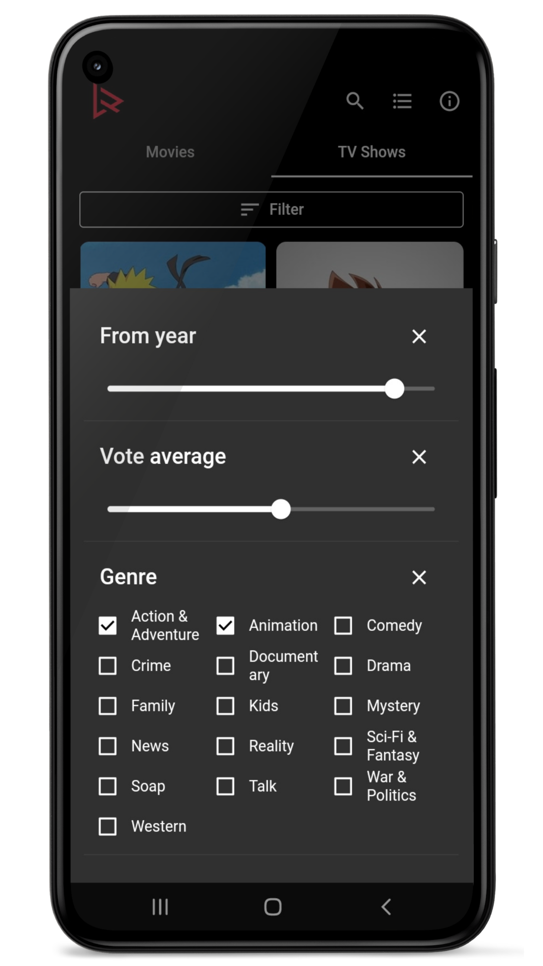 Apply filters for genre, release year, average rating and age rating to find amazing movies and tv shows. The app also recommends other movies and tv shows based on what you browse.