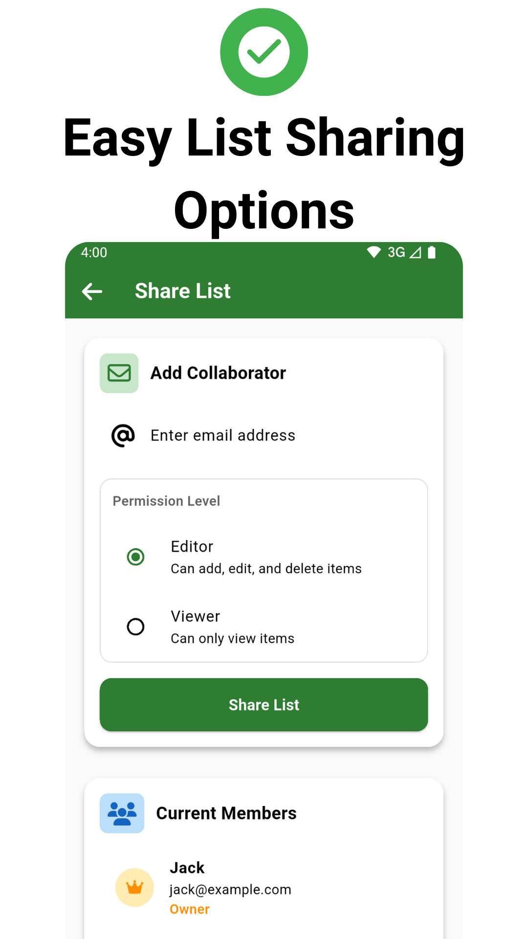 Share lists instantly with family members and friends via email. Set different permission levels - owners, editors, or viewers. Real-time synchronization ensures everyone stays updated on shopping progress.