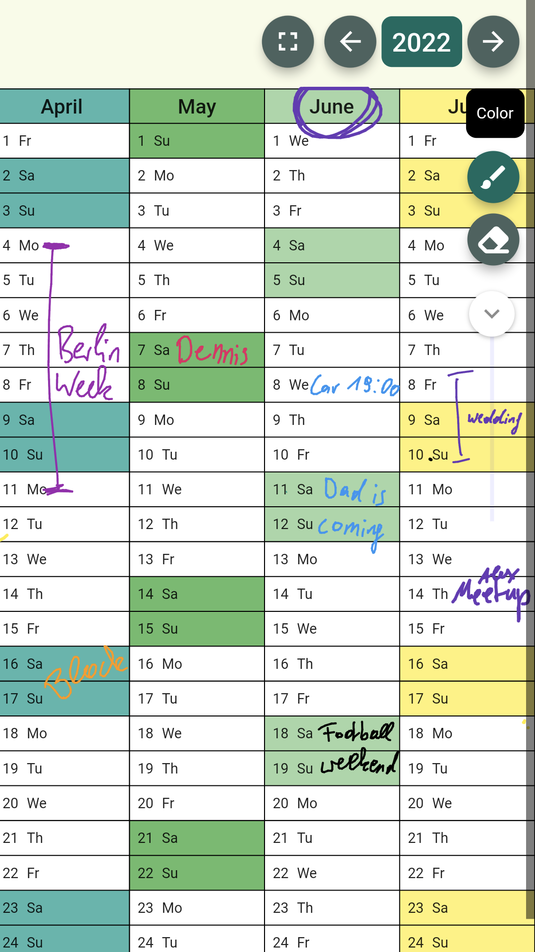 With this app you can easily draw on the calendar. Just choose your color and start drawing your appointments for this, next or whenever.