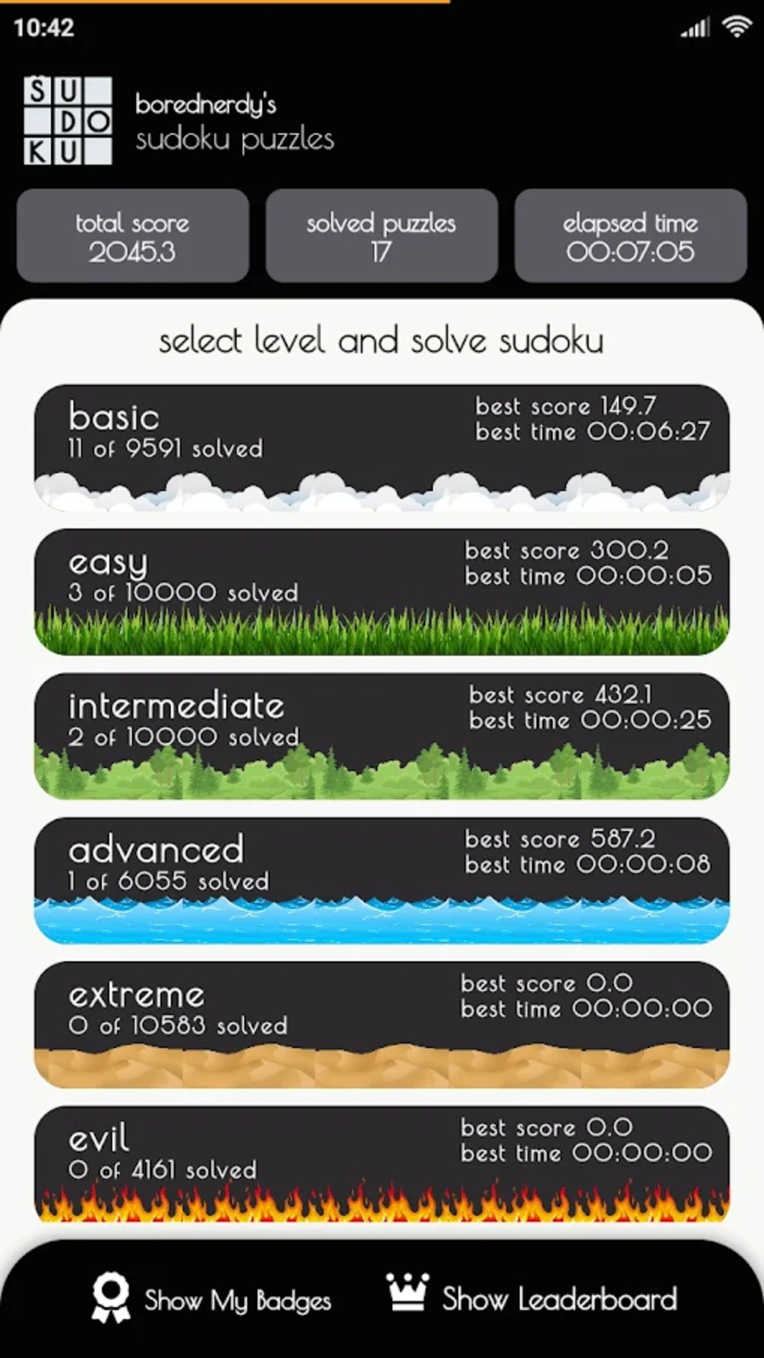 While playing Sudoku Puzzles you can earn various badges as you solve puzzles. With these badges, you can prove what a master sudoku solver you are. There are a total of 18 different badges, from Junior Sudoku Solver to Legendary Sudoku Solver.