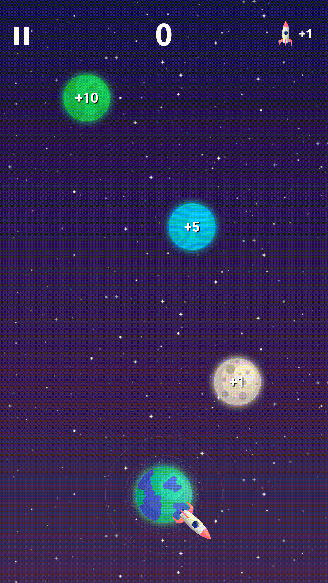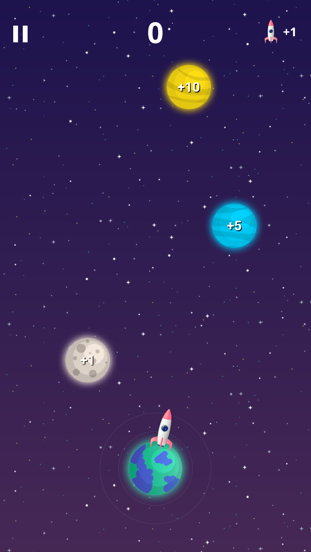 TTG - Through The Galaxies is a casual game. You control a rocket to go through some planets (starting with the Earth). You gain scores based on the planet level that you hit (1, 5, 10).