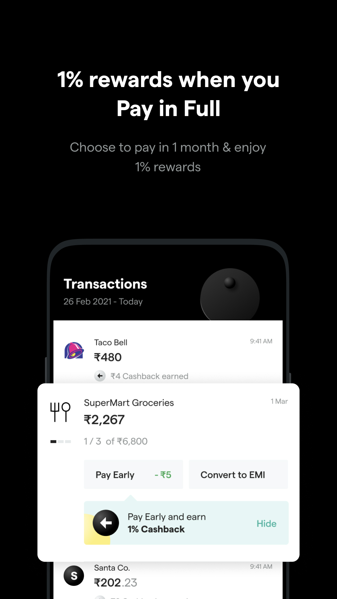 3. Convert your transactions to 6/9/12/18+ EMIs (Coming soon) - Take all the time you need. Choose affordable longer EMI plans for your spends.