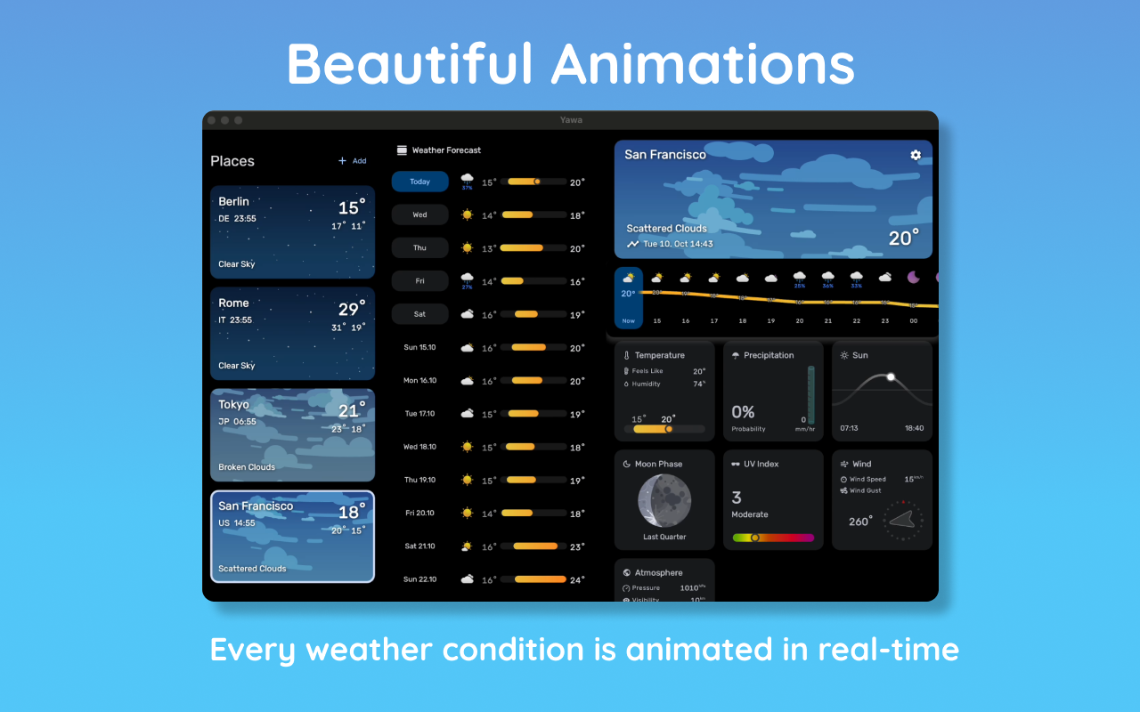 Welcome to Yet another weather app (aka Yawa), your ultimate weather companion with real-time weather animations and an intuitive design. With the Timeline and the Daily Overview you'll have all the information to give you the confidence to plan your day and week.